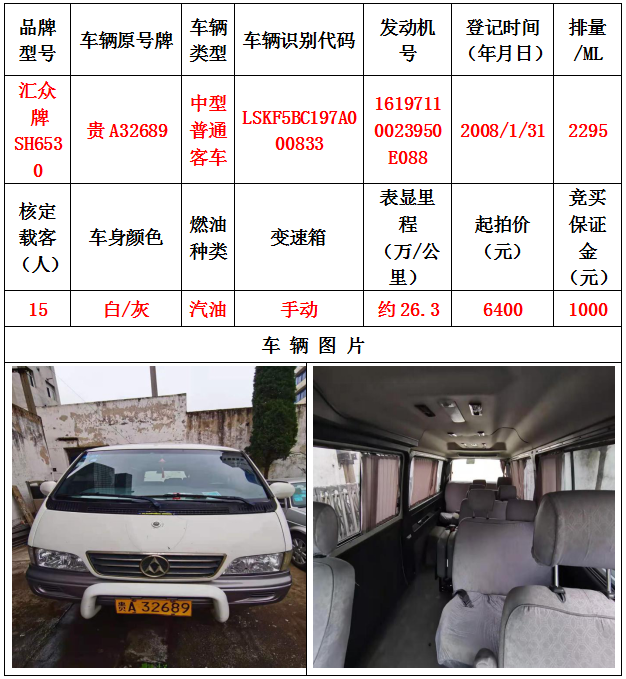 拍品編號(hào)2:匯眾牌SH6530中型普通客車(chē)