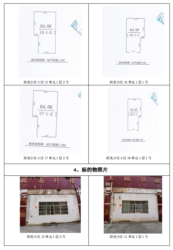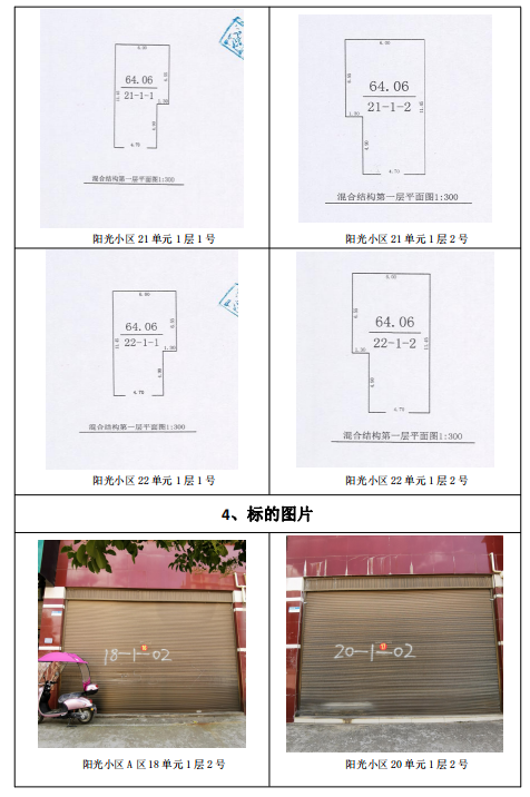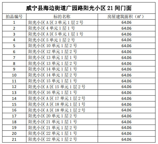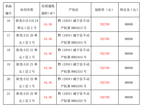 拍品編號16-21號標(biāo)的位于威寧縣海邊街道廣園路陽光小區(qū),房屋結(jié)構(gòu)均為:混合結(jié)構(gòu),權(quán)利性質(zhì):國有土地/出讓/其他,用途:商服用地/商業(yè)服務(wù),使用期限:2012年12月20號至2052年12月19日。
