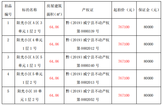 拍品編號1-5號標(biāo)的位于威寧縣海邊街道廣園路陽光小區(qū),房屋結(jié)構(gòu)均為:混合結(jié)構(gòu),權(quán)利性質(zhì):國有土地/出讓/其他,用途:商服用地/商業(yè)服務(wù),使用期限:2012年12月20號至2052年12月19日。
