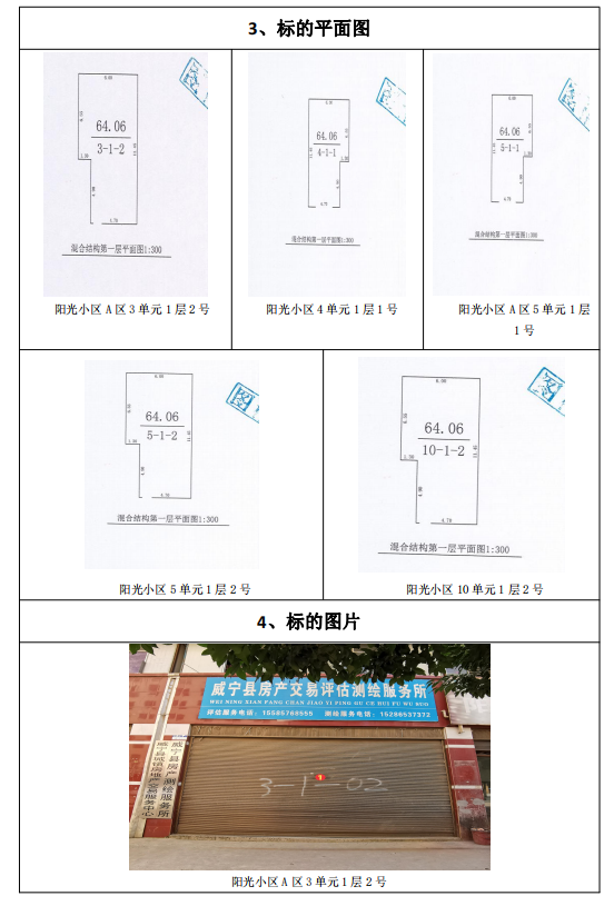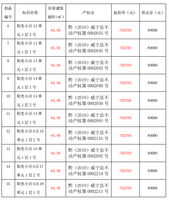 拍品編號6-15號標(biāo)的位于威寧縣海邊街道廣園路陽光小區(qū),房屋結(jié)構(gòu)均為:混合結(jié)構(gòu),權(quán)利性質(zhì):國有土地/出讓/其他,用途:商服用地/商業(yè)服務(wù),使用期限:2012年12月20號至2052年12月19日。