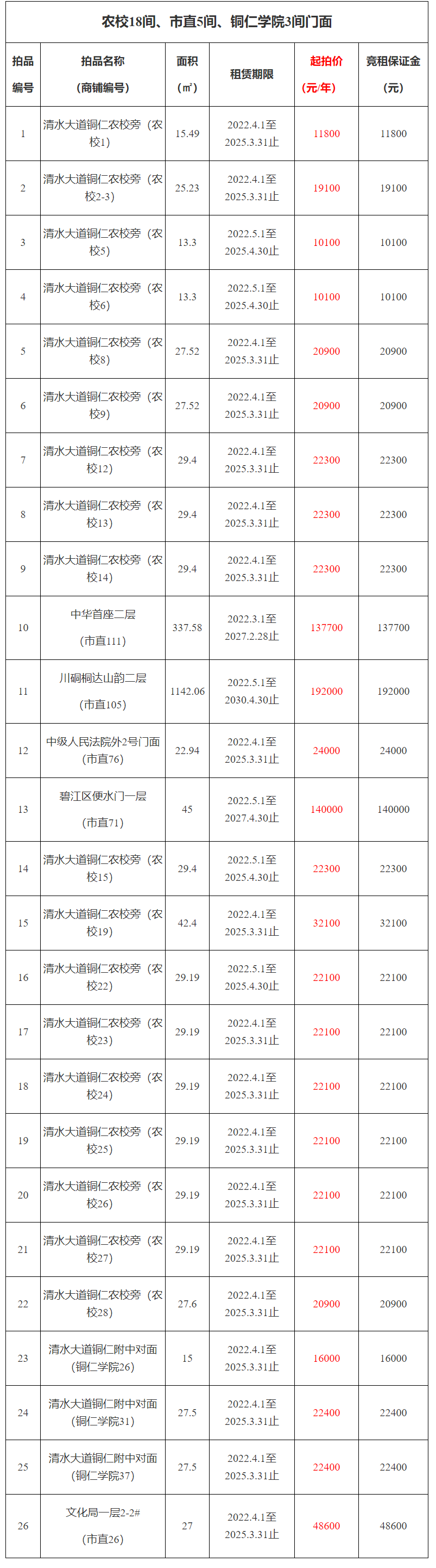 2、清水大道銅仁農(nóng)校旁(商鋪編號:農(nóng)校2-3),面積:25.23㎡,租賃期:3年,起拍價(jià):19100元/年,競租保證金:19100元;